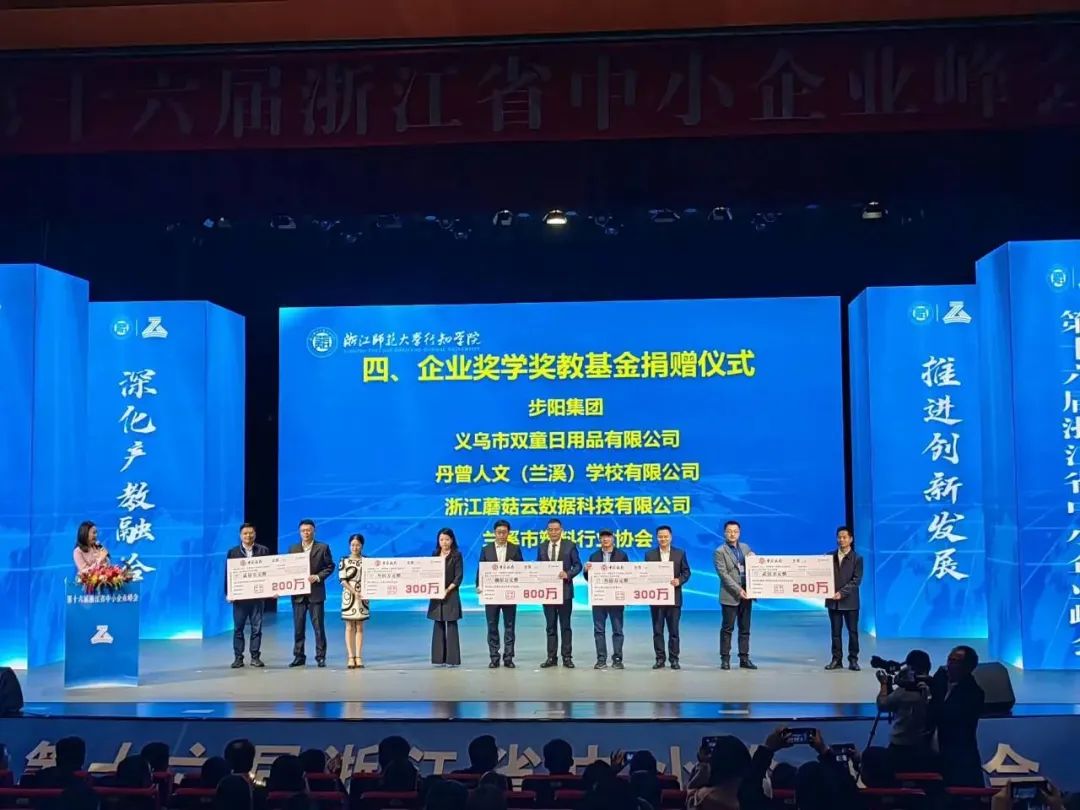 會議期間,浙師大行知學院舉行了第十四屆“步陽集團獎助學金”發放儀式。自2010年以來,步陽集團攜手行知學院設立800萬獎學助學基金,徐董事長代表步陽集團已累計發放獎教金、獎學金280萬元,超過1600余名師生受益,是目前行知學院歷史最悠久,受益最廣泛,影響最深遠的企業家助學金之一;徐步云董事長多年來一直堅持獎學助學的善舉,贏得了現場到會師生的陣陣掌聲。