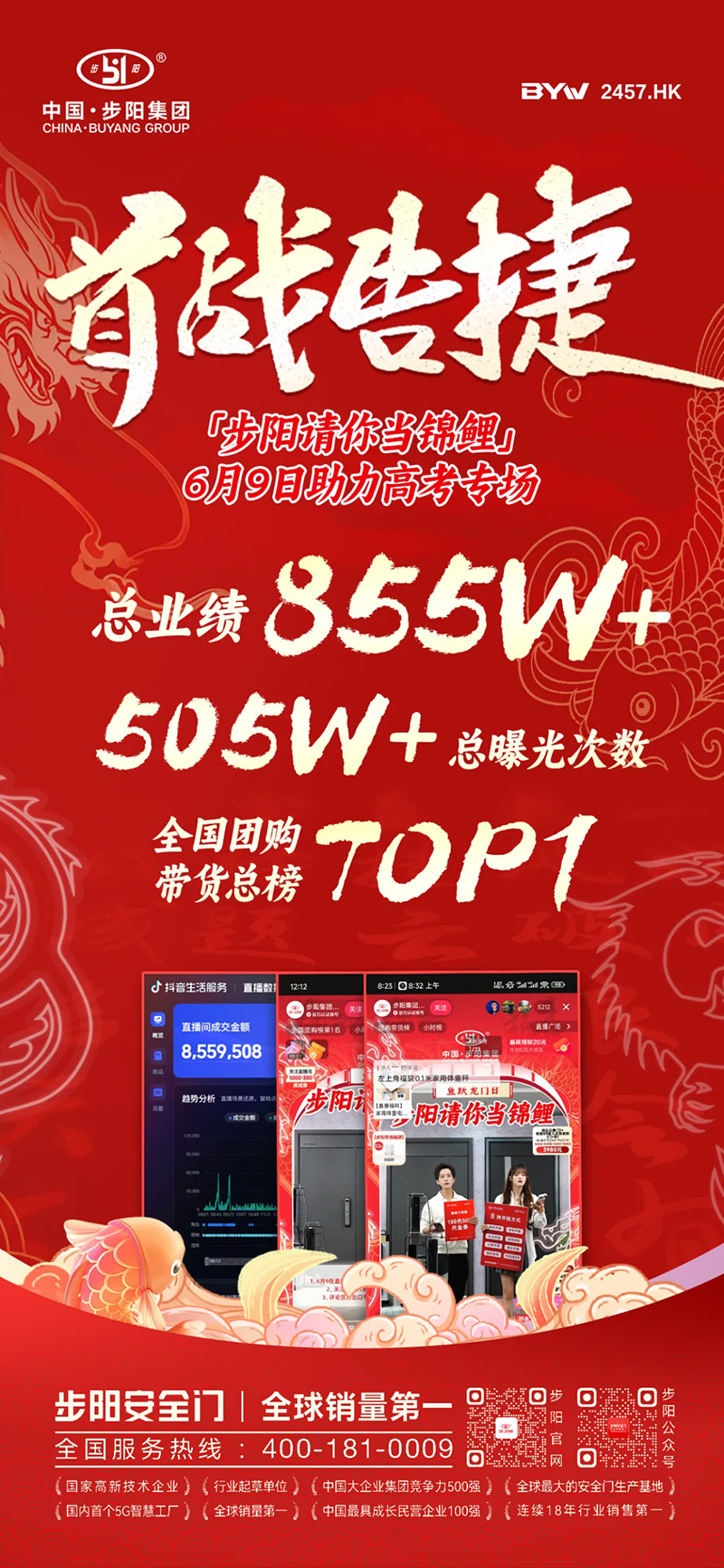 On June 9th, Buyang Group submitted a report card that ignited the industry: the first special live broadcast set an astonishing record in just ten hours - live sales exceeded 8.55 million+, total exposure reached 5.05 million+, and the total number of orders exceeded 3000! With this impressive data, Buyang has climbed to the top of the national sales ranking, breaking the record for live streaming in the door industry category and launching a beautiful battle of online channel strategic transformation!