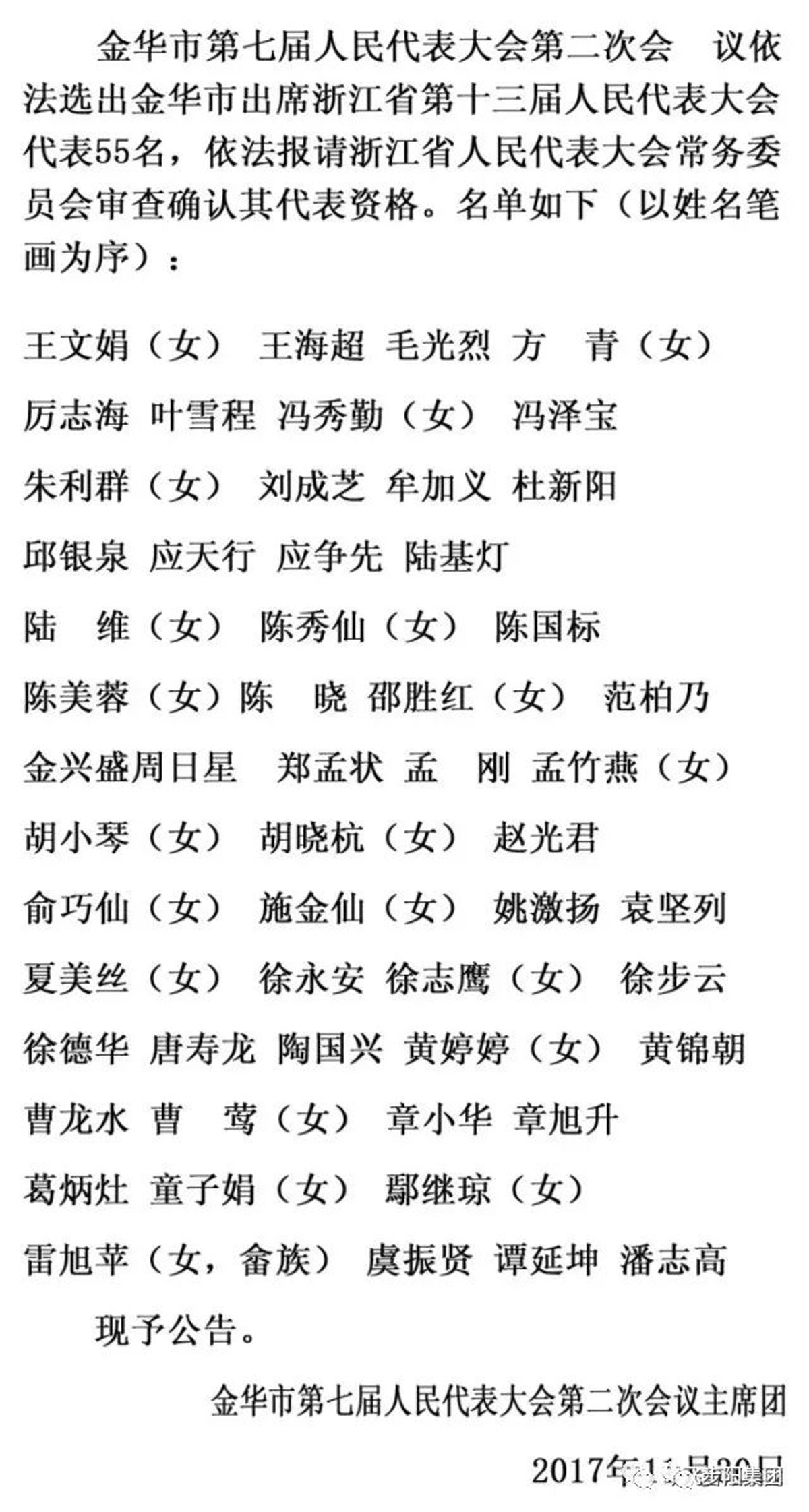 本次大會上,通過無記名投票方式進行差額選舉,選舉產生出55名金華市出席浙江省第十三屆人民代表大會的代表。