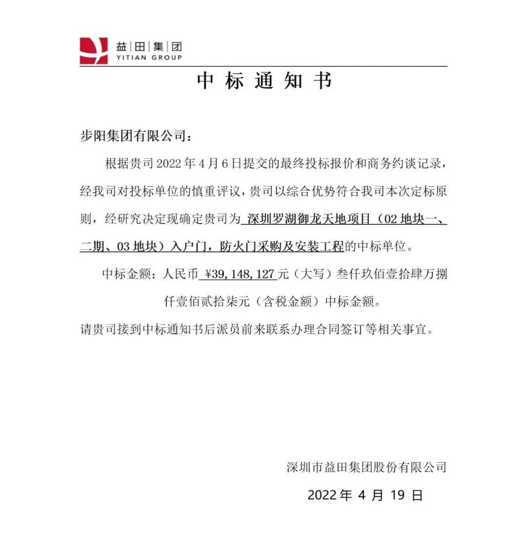 目前,步陽集團中標益田集團深圳羅湖“御龍天地”綜合體項目。這是步陽與益田簽定戰略集采協議后,步陽再次為益田深圳羅湖項目提供整體用門解決方案,單項目簽約金額近4000萬元。