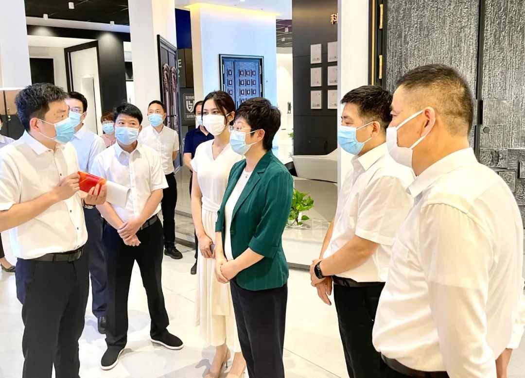 在徐董事長的介紹下,蔡主席詳細了解步陽目前的生產經營、技術創新和市場戰略布局規劃,對步陽集團多年來深耕門業,聚焦實體經濟,帶動永康市經濟發展給予贊許和肯定。當聽到徐璟珺委員介紹門的文化、門的故事,特別是一樘門可以通過表面多種材料的運用進行定制化生產后,對步陽近年來市場需求把控和產品技術研發創新,并建立起步陽特色的研發路線與企業競爭力的做法表示高度認可。